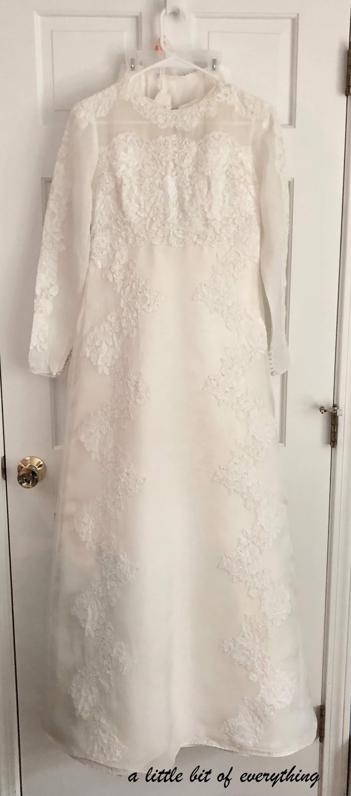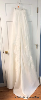 "Oxi Clean White Revive" worked its magic on both the gown and the train. I dissolved about two of Oxi Cleans measuring cups in hot water in the tub then adjusted the water temperature to warm and soaked the gown for about six hours, moving it around occasionally and flipping it over.